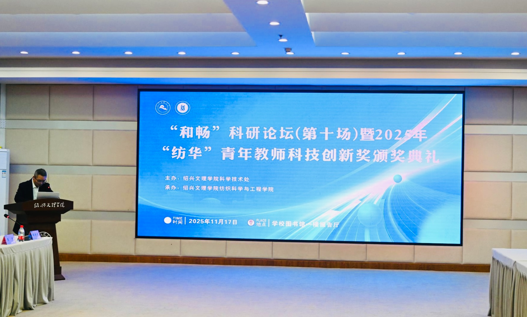 2025年11月17日下午,“和畅”科研论坛(第十场)暨2025年“纺华”青年教师科技创新奖颁奖典礼在学校图书馆一楼报告厅举行。国家碳纤维工程技术研究中心主任、北京化工大学教授徐樑华,南京玻璃纤维研究设计院科技发展部部长匡宁,学校科学技术处处长寿建昕,纺织科学与工程学院党委书记王东亮、副院长董爱学等出席活动,纺织科学与工程学院院长邹专勇主持活动,全校师生代表50余人参会。