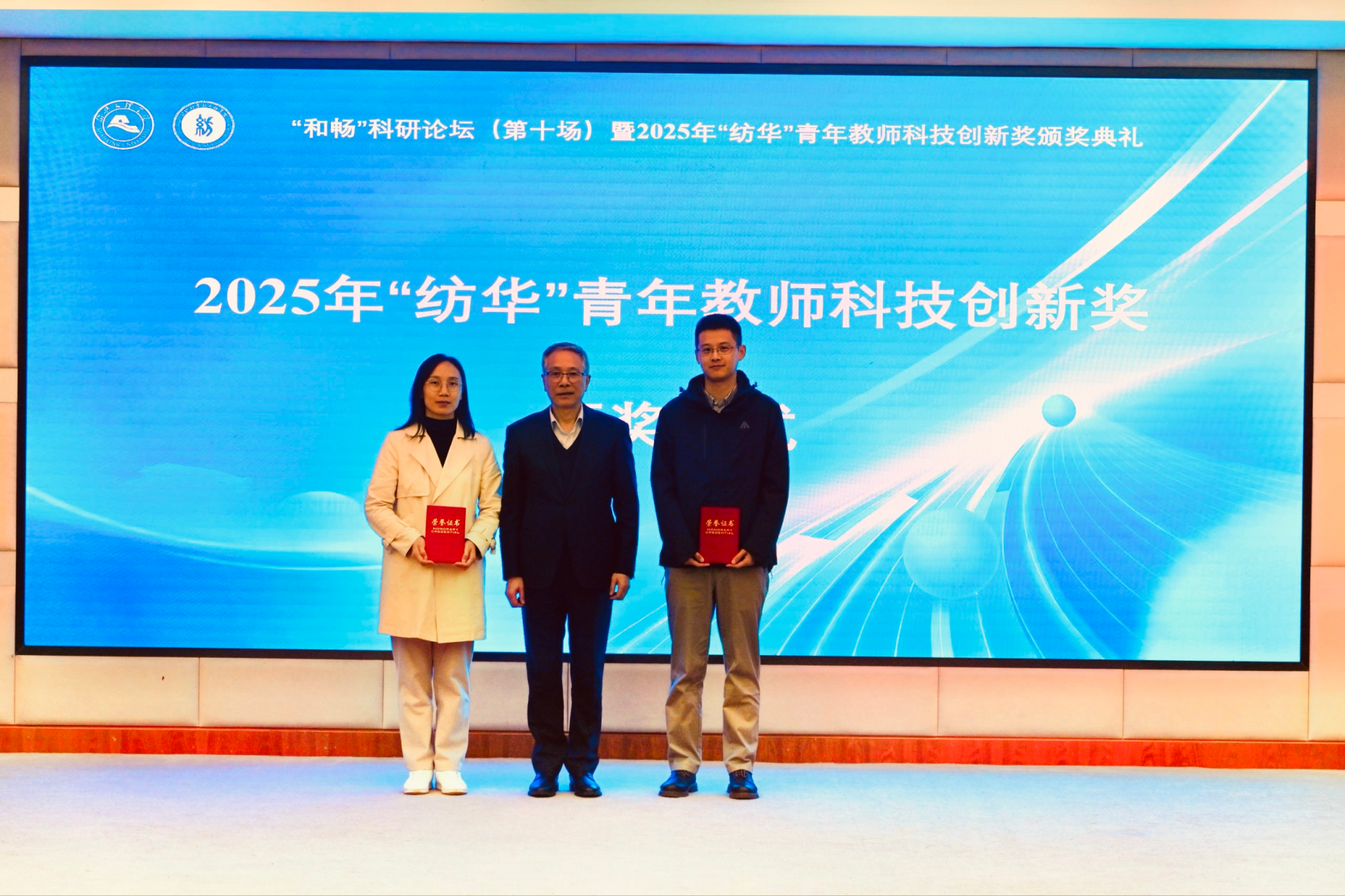 王东亮宣读了《关于表彰2025年“纺华”青年教师科技创新奖获奖教师的决定》。在热烈的掌声中,徐樑华教授为获奖教师颁发了荣誉证书。颁奖仪式后,获奖教师代表王玉博士发表感言。