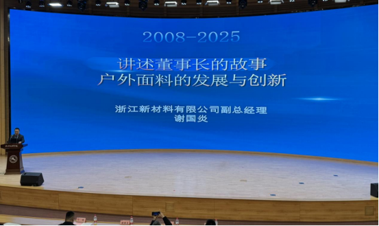 育人报告会阶段,谢国炎以《讲述董事长的故事——户外面料的发展与创新》为题,为在场师生带来了一场深刻而生动的育人报告,浙江东进新材料有限公司董事长陈明贤是我校的优秀校友,积极投身户外面料创新研发与推广。他结合企业发展历程,通过融入董事长的创新创业故事,分享了户外功能性面料领域的技术突破与创新思考,激发了同学们对专业前沿的浓厚兴趣。作为学校省级重点支持建设的纺织智造现代产业学院副理事长单位,东进新材料深度参与学院育人全过程。公司副总经理谢国炎受聘为学院产业教授,亲自指导学生“户外新生”创新创业项目,为学校在2025年中国国际大学生创新大赛中实现金奖“零的突破”提供技术指导。随后,在中国国际大学生创新大赛(2025)中获得金奖项目的“户外新生”团队进行了精彩路演,展现了学院学子将专业知识转化为创新成果的卓越能力。