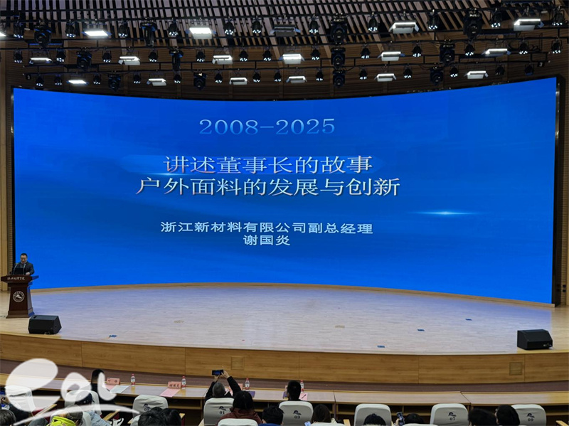 育人报告会阶段,谢国炎副总经理以《讲述董事长的故事——户外面料的发展与创新》为题作专题报告。作为我校优秀校友,浙江东进新材料有限公司董事长陈明贤在户外面料创新领域的创业故事,引发了师生对专业前沿的浓厚兴趣。
